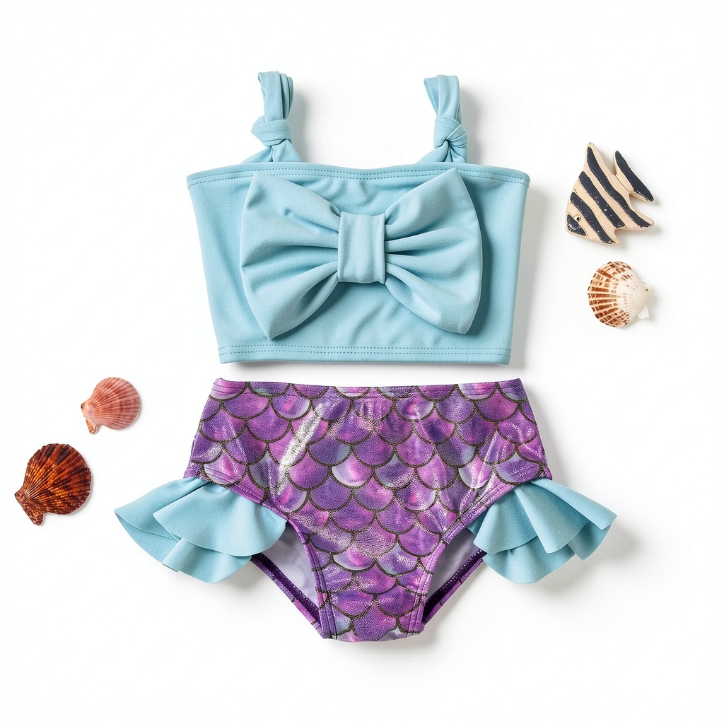 This baby girl mermaid bikini set is designed for comfort and style, made from high-quality Polyamide and Elastane fabric that is stretchy, quick-drying, and skin-friendly. The set includes a sleeveless top with an adjustable shoulder strap and a bowknot detail, paired with a matching mermaid print ruffle bikini bottom. It is available in sizes ranging from 6-12 Months to 3-4T, ensuring a perfect fit for toddler girls. The lightweight material provides all-day comfort, making it ideal for active play in water environments.