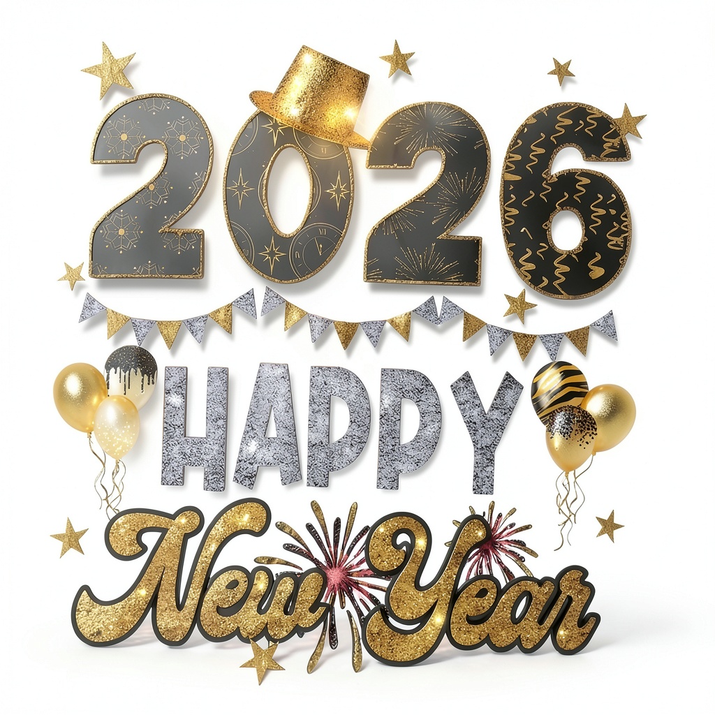 - Vibrant Happy New Year 2026 design with golden confetti and star accents for a festive look.